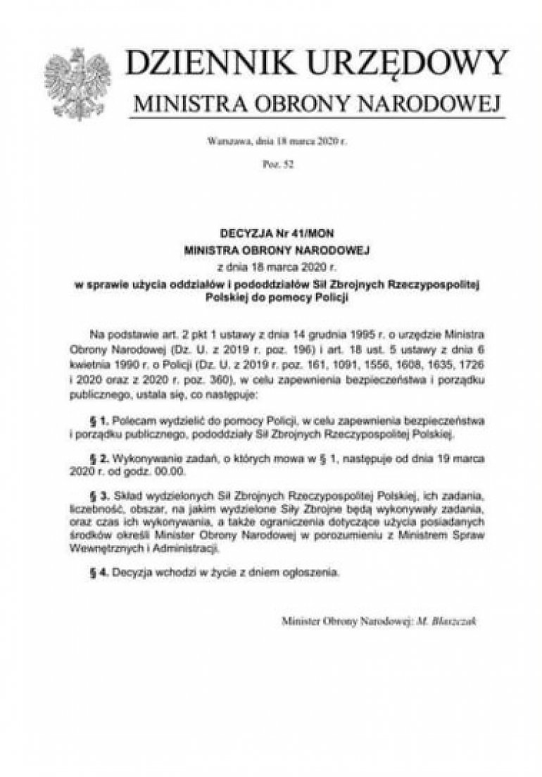 - Decyzja Ministra Obrony z 18 marca 2020 r. w sprawie użycia oddziałów i poddodziałow Sił Zbrojnych RP do pomocy Policji, wydaje się racjonalna i zrozumiała. Jeżeli zestawimy liczbę policjantów w Polsce, która nie sięga nawet 100 tys. funkcjonariuszy z liczbą poddanych kwarantannie, a jest to już ok. 40 tysięcy obywateli, to nikt nie ma złudzeń, że liczba poddanych kwarantannie, których należy kontrolować, będzie wzrastać. Do tego w największych miastach Policja od lat boryka się z problemem nieobsadzonych etatów. Poza tym formacja ta w pierwszej kolejności została powołana do zwalczania przestępczości i nadal musi realizować ustawowe obowiązki, których nie można zawiesić na czas zagrożenia epidemicznego. Straż Graniczna jak do tej pory dobrze radzi sobie z blokadą granic. Dodatkowo nie możemy wykluczyć, że Polska pójdzie drogą Włoch, Austrii i Republiki Czeskiej i wprowadzi limitowanie możliwości poruszania się jedynie do dojazdu do pracy, wizyt u lekarza, w aptekach i sklepach spożywczych. Takie są realia „stanu oblężenia epidemiologicznego”.