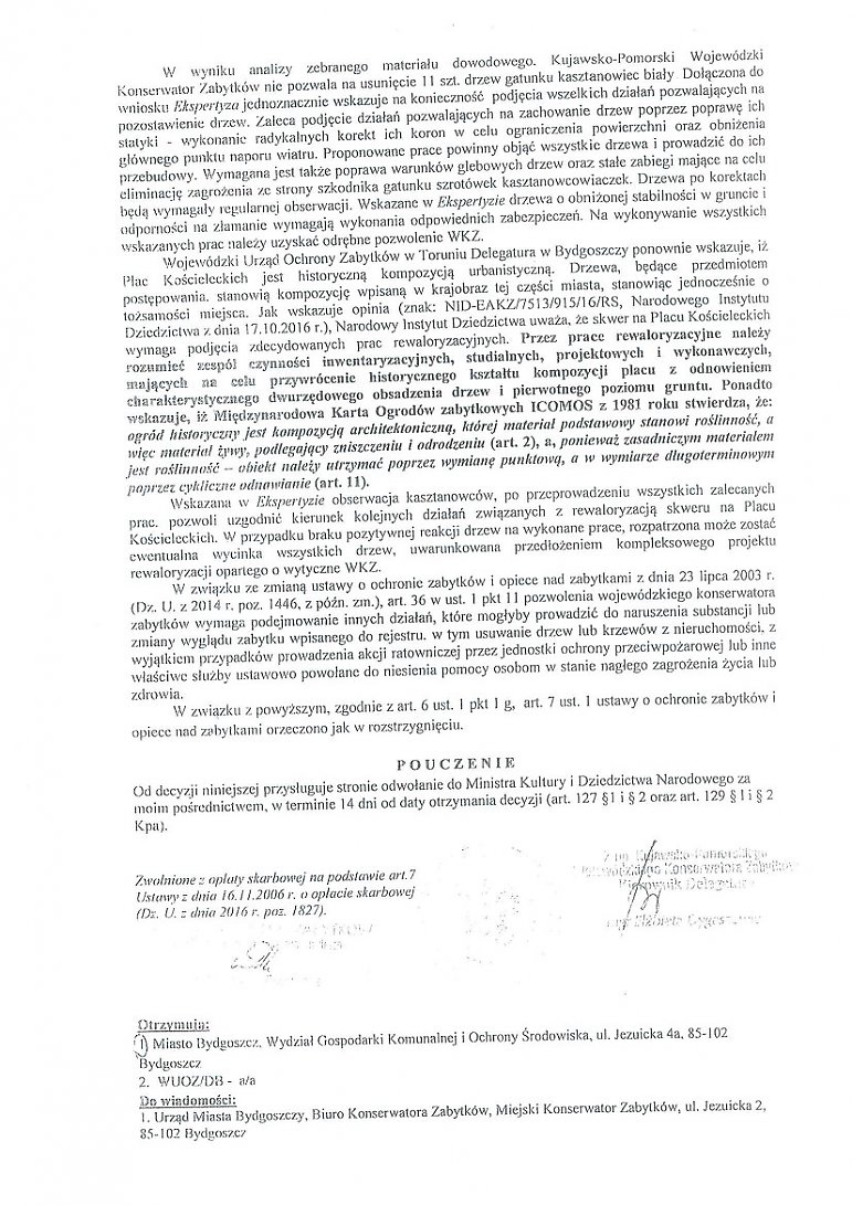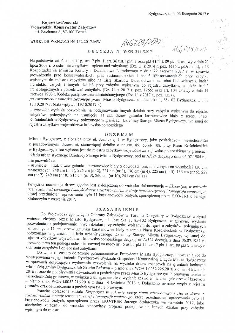 Jak informuje ratusz, decyzja o braku zgody na usunięcie 11 drzew wpłynęła wczoraj. Rzecznik prezydenta Bydgoszczy, Marta Stachowiak jednocześnie informuje, że miasto nie będzie odwoływało się od decyzji konserwatora.