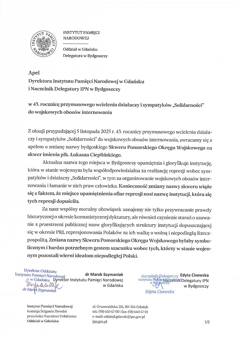 Instytut Pamięci Narodowej apeluje o zmianę nazwy Skweru Pomorskiego Okręgu Wojskowego na Skwer im. płk. Łukasza Cieplińskiego. Dyrektor IPN w Gdańsku, dr Marek Szymaniak, podkreśla, że Pomorski Okręg Wojskowy był odpowiedzialny za represje wobec działaczy „Solidarności” oraz organizowanie obozów internowania. W związku z tym miejsce pamięci osób represjonowanych nie powinno być nazwane na cześć takiej instytucji.