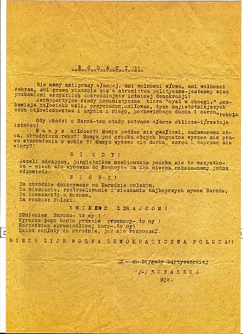 Fragment ulotki z marca 1946 roku autorstwa mjr. Zygmunta Szendzielarza "Łupaszki":