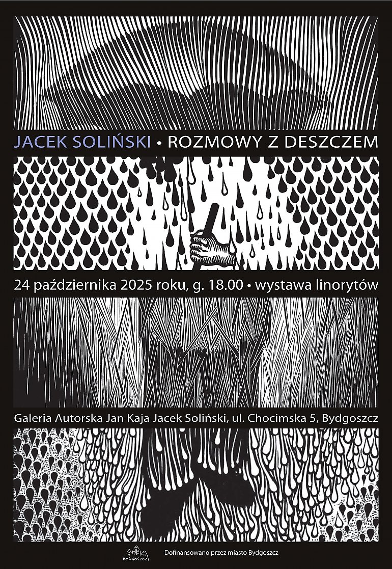 Galeria Autorska Jana Kaji i Jacka Solińskiego zaprasza na wystawę linorytów Jacka Solińskiego zatytułowaną „Rozmowy z deszczem” oraz prezentację jego zapisków o przyrodzie i duchowości. Otwarcie wystawy 24 X 2025, godz. 18.00, Galeria Autorska Jan Kaja i Jacek Soliński ul. Chocimska 5, Bydgoszcz.
