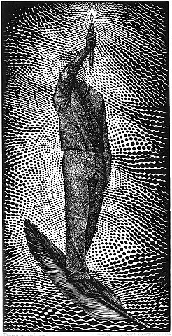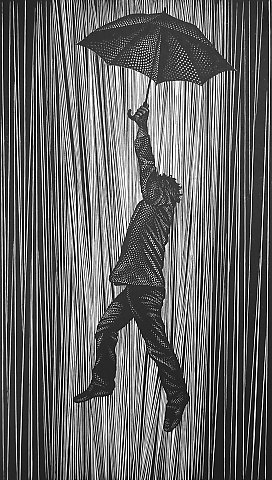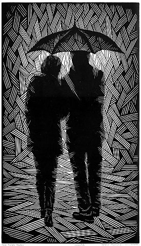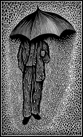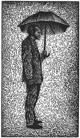 Spośród linorytów, które poświęciłem tematowi deszczu, wyjątkowo dwa są dla mnie ważne: „Zamiatanie deszczu” oraz „Pod parasolem pada deszcz”. Może dlatego o nich wspominam, bo ocierają się o anomalie, przecież nie zamiata się deszczu, ani pod parasolem nie pada deszcz, a jednak te czynności poddają się wspaniale poetyckiej narracji. Wobec tego tematu czuję szacunek, bo w tej metaforze ukrywa się tak wiele. Deszcz zdaje się „wiedzieć” wszystko, jest w nim pradawna wiedza o życiu i jego zagładzie.
