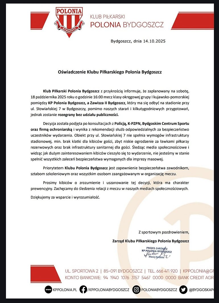 "Decyzję podjęto ze względów bezpieczeństwa po konsultacjach z Policją, K-PZPN, Bydgoskim Centrum Sportu oraz firmą ochroniarską" – poinformowała na swoich mediach społecznościowych KP Polonia Bydgoszcz.