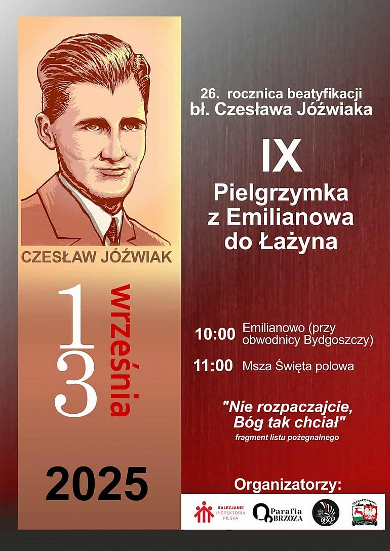 W sobotę 13 września parafia w Brzozie Bydgoskiej wraz z Księżmi Salezjanami zaprasza na uroczystości inaugurujące nowy rok katechetyczny. O godzinie 11.00 odprawiona zostanie Msza święta przy miejscu narodzin błogosławionego Czesława – w Łażynie.